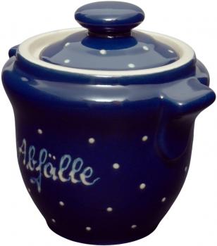 Unser Abfalltopf mit Deckel hat einen Durchmesser von 12 cm, eine max. Breite mit Henkeln von 14 cm eine Höhe ohne Deckel von 11,2 cm und mit Deckel von 14 cm. Der Inhalt beträgt 650 ml.