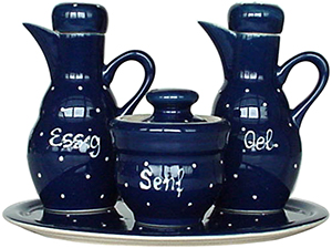 Wenn Sie eine konkrete Form suchen, finden Sie hier vom Eierbecher bis zum Brottopf 250 verschiedene Formen, die in 12 Kategorien beispielhaft im Dekor Blau 1 Punkt unten dargestellt werden. Jede Form stellen wir in über 30 Dekoren her, die Sie unten auswählen können.