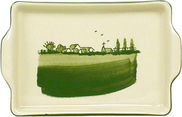 Die Platte 19 ist eckig mit Henkeln auf beiden Seiten und hat eine größte Länge von 21,5 cm, ohne Henkel 19,4 cm und eine Breite von 13,6 cm. Ideal ist sie für das Servieren von Fleisch, Wurst, Käse und natürlich Kuchen und Torten als Buffetplatte, Wurstplatte, Fleischplatte, Kuchenplatte und Käseplatte für kleine Portionen.